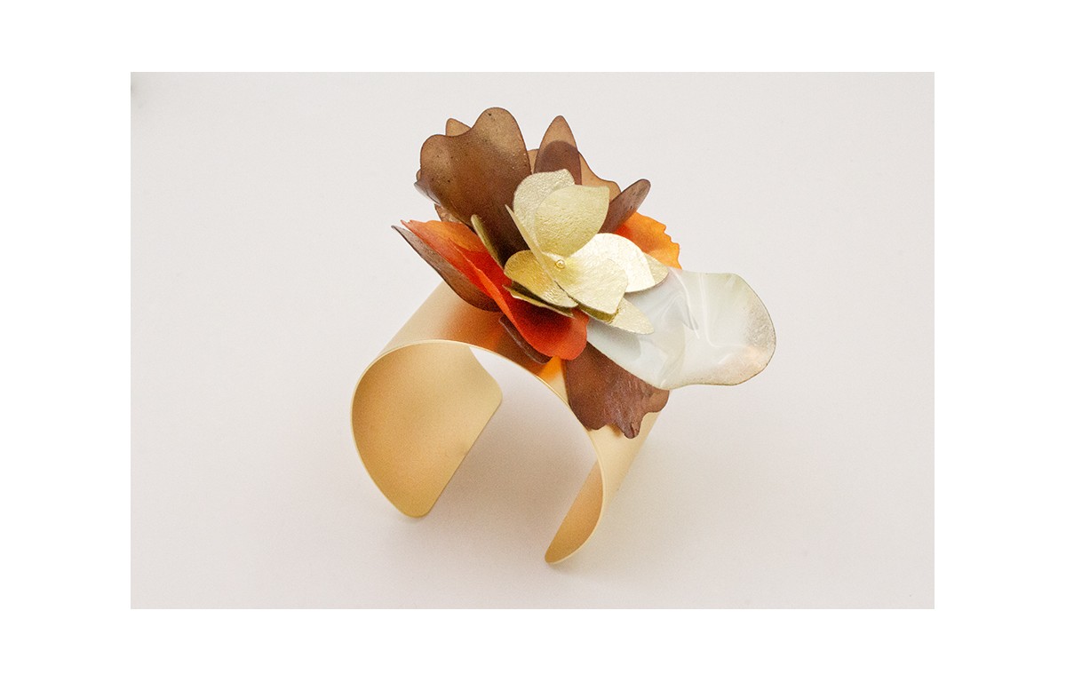 Brazalete con rosetón de lentejuelas, doradas,verde agua, naranja y marrón.