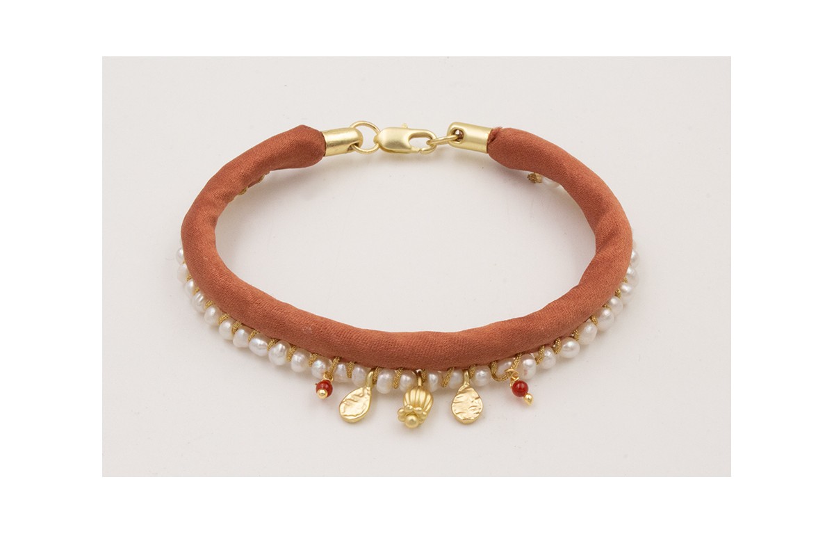 Pulsera de seda rellena cobrizo con perlas cosidas con hilo dorado y colgante lámina labrada pequeña y campanilla dorada mate.