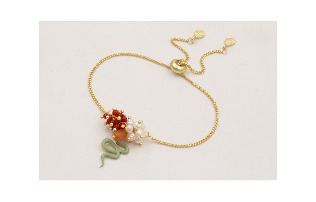 Pulsera cadena eslabón plano con centro de burruño bolitas coral y perlitas colgante serpiente esmlatada turquesa.