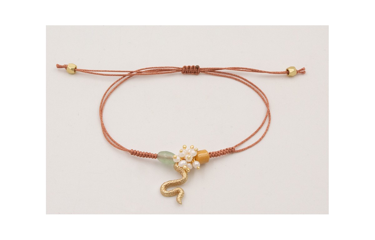 Pulsera cordón metálico oro rosa nudo serpiente con burruño perlas y culebra dorada mate colgando.