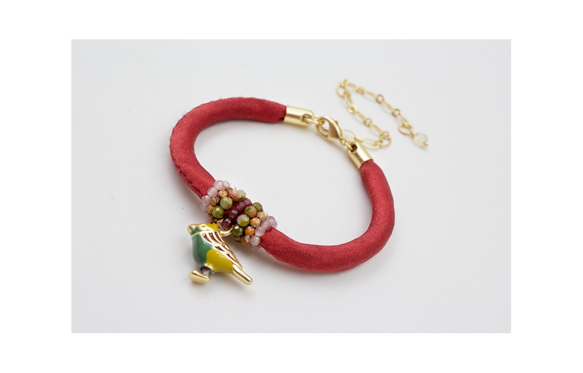 Pulsera de seda rellena color granate con aritos de semipreciosas y pájaro esmaltado turquesa, pistacho y granate.