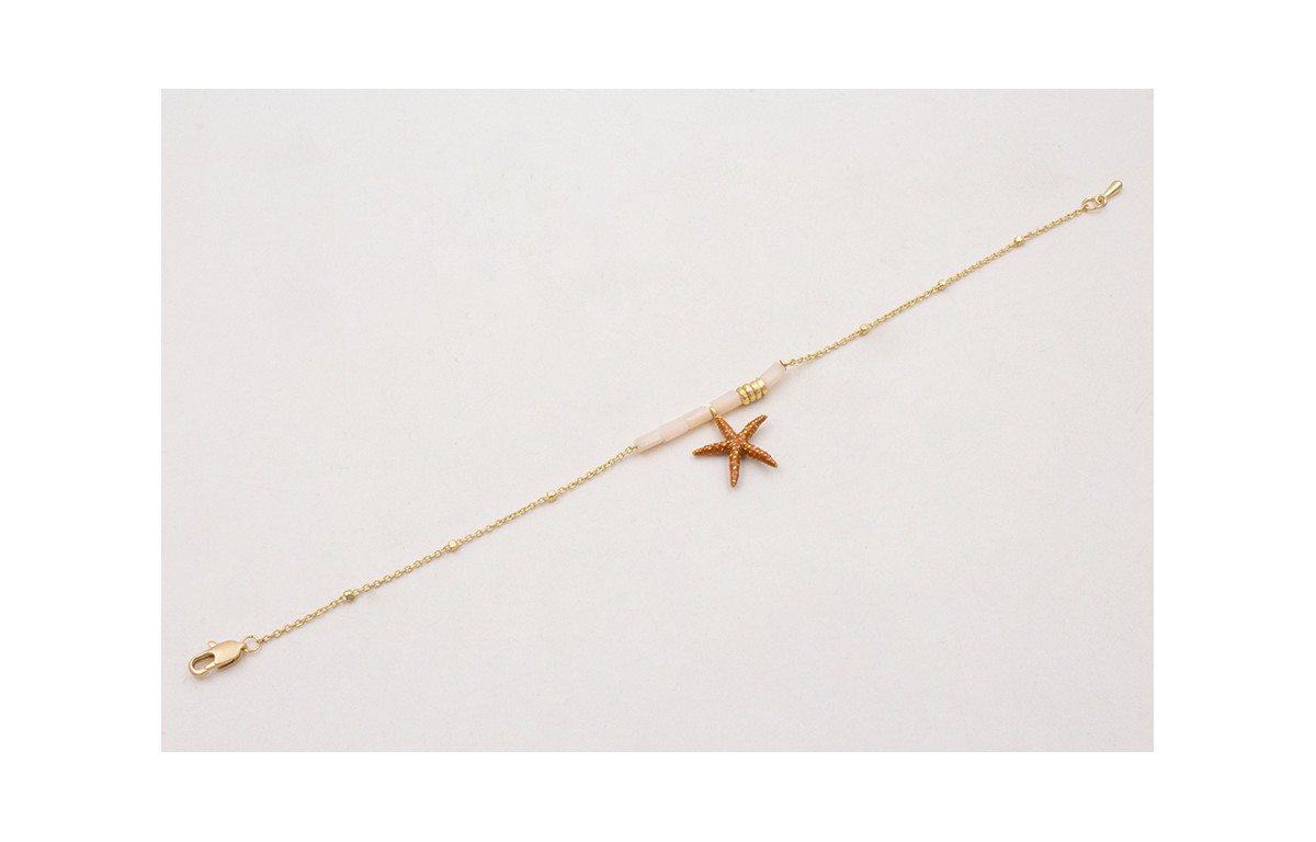 Pulsera cadena microbola con rectangulos beige,estrella de mar marron y entrepiezas doradas