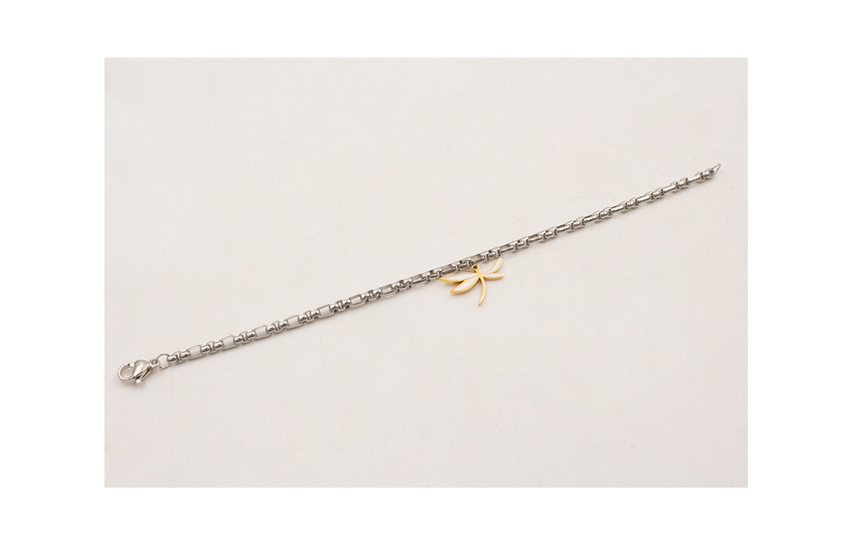 Pulsera cadena ACERO plateada eslabon tubular con libelula esmaltada blanca