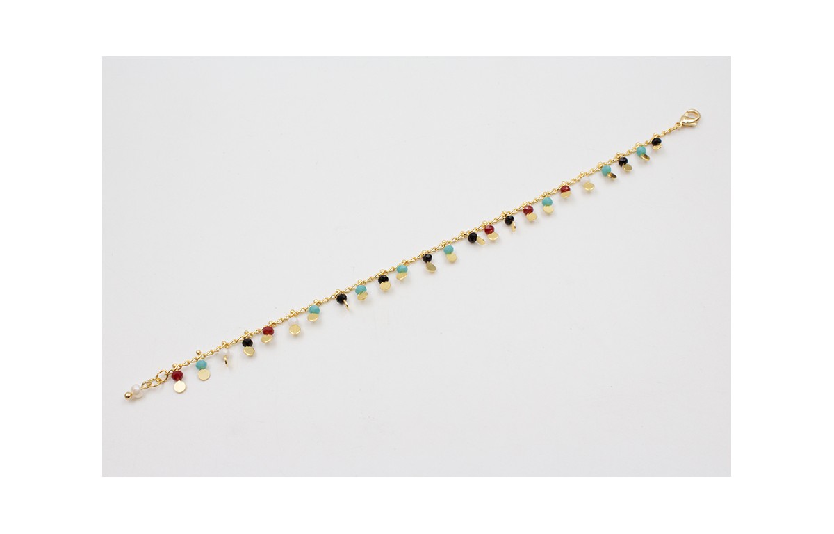 Pulsera de cadena chapitas doradas y piedras multicolor rematada con perlita natural.