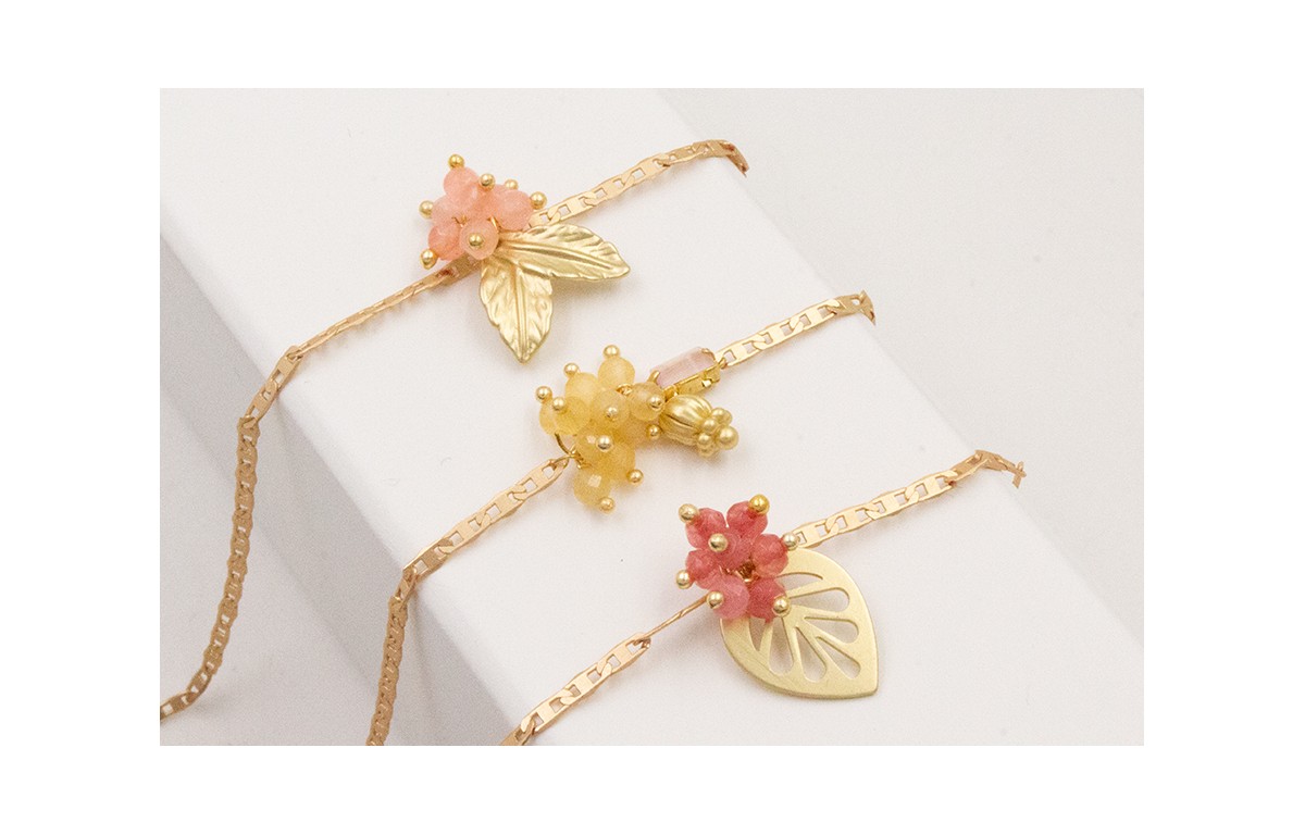 Pulsera cadena ovalos dorado mate con colgante campanilla, strass cristal rosa y burruño bolitas amarillas.