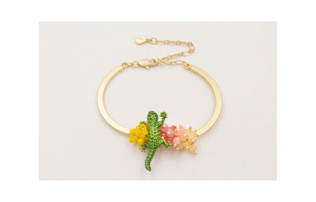 Pulsera semi rigida con burruño bolitas, ramas abalorios amarillas, largo esmaltado verde remata con cadena.
