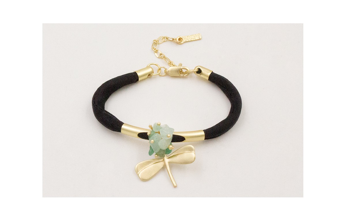 Pulsera seda natural rellena negra con tubo arqueado abierto dorado mate con colgante libélula y burruño chips jade.