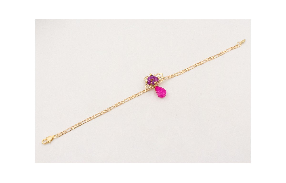 Pulsera cadena eslabones intercalados con centro flor alambre doradoa mate con burruño bolitas moradas y gota fucsia.