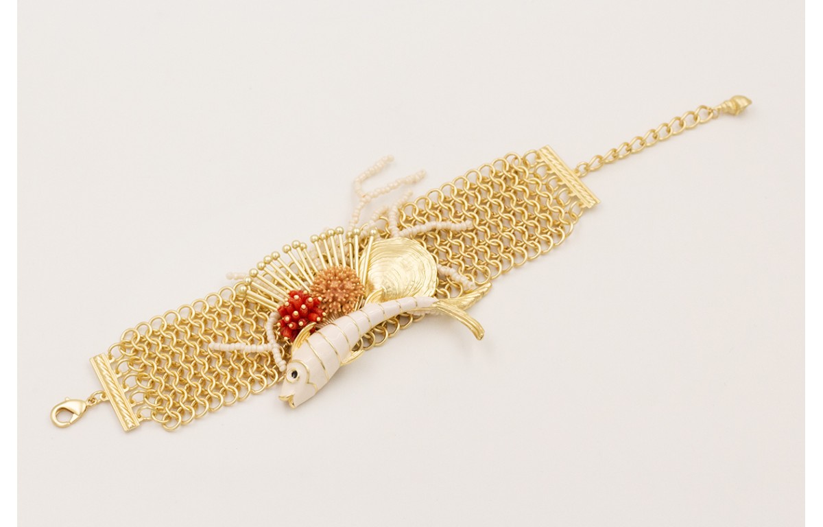 Brazale cadena malla con pez esmaltado beigemburruño micro tubito coral, concha dorada mate,nenufar esmalte melocotón,rama coral abalorio blanco.