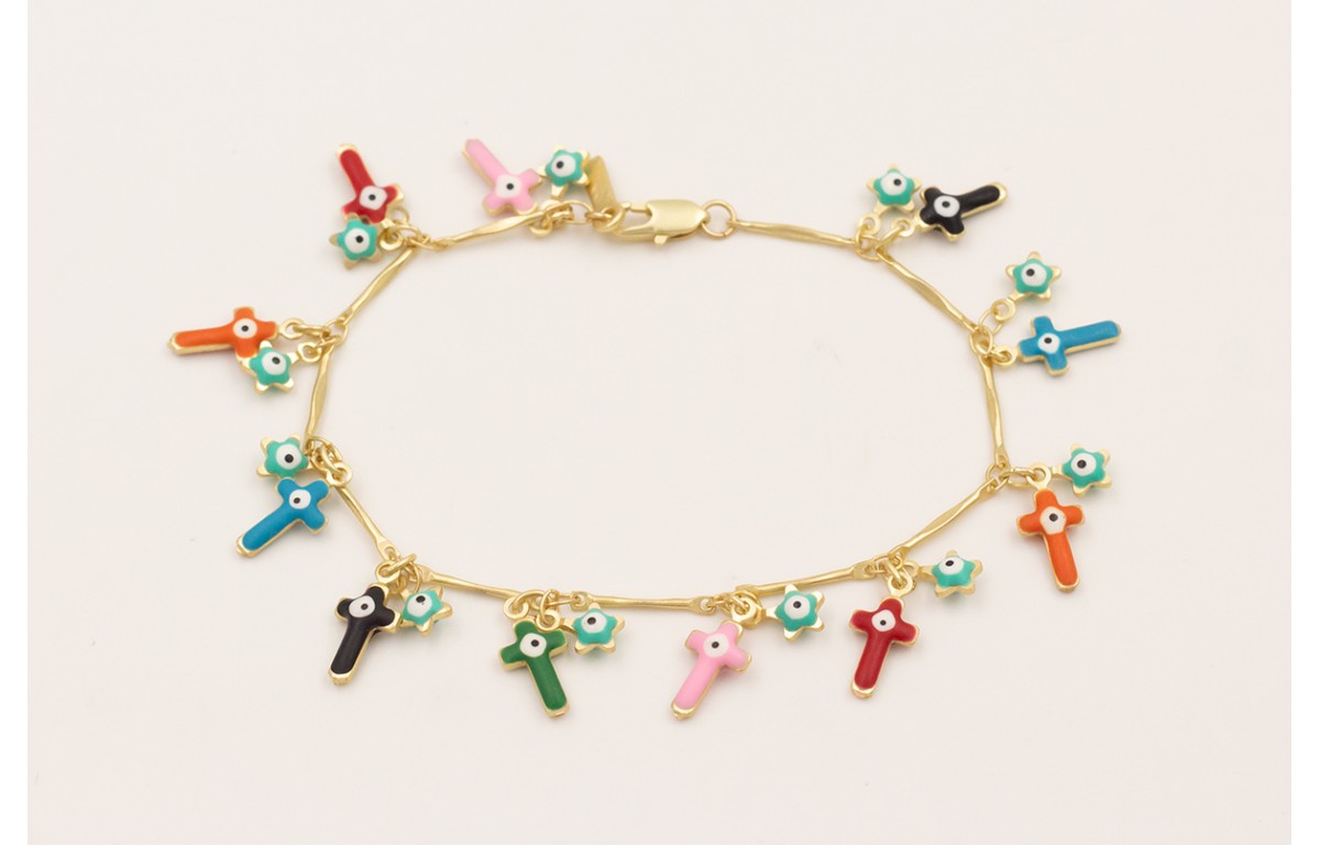 Pulsera cadena estrellas con ojos turcos y colgando cruces de corlores con ojos turcos.