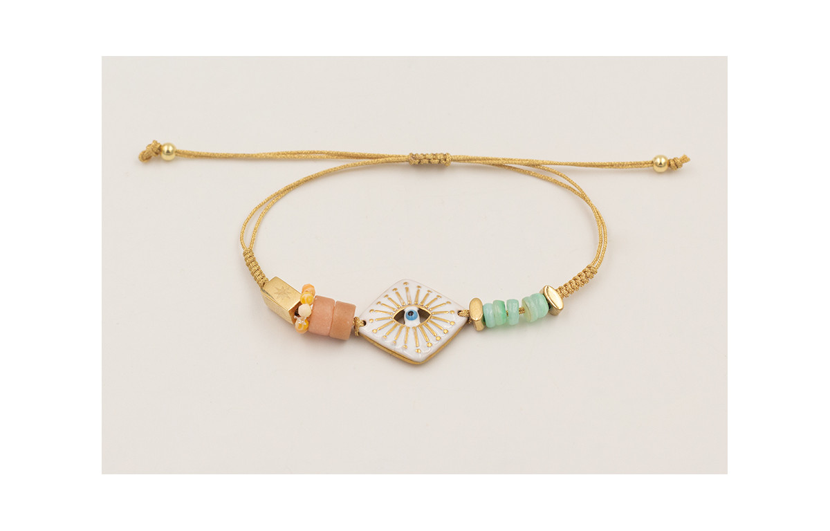 Pulsera de acero inoxidable con hilo dorado nudo serpiente, rombo ojo turco esmaltado blanco, discos coral color tuequesa, tubo rectangulo, arito facetadas rositas.