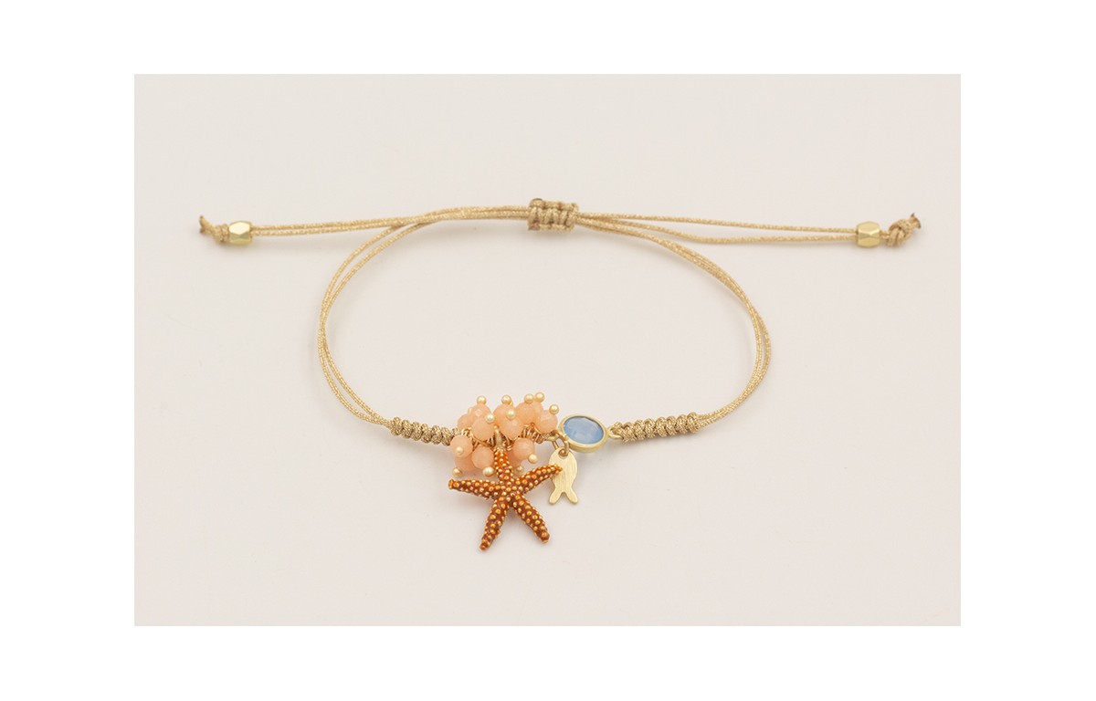 Pulsera hilo dorado con nudo serpiente, burruño facetadas rosadas, estrella esmaltada marrón, brillo cristal azul, pez pequeño dorado.