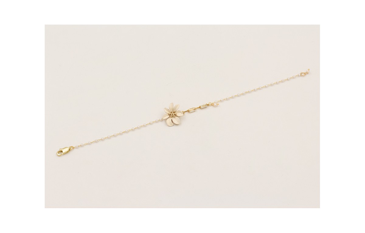 Pulsera cadena perlas, cadena strass bagette cristal, flor beige.