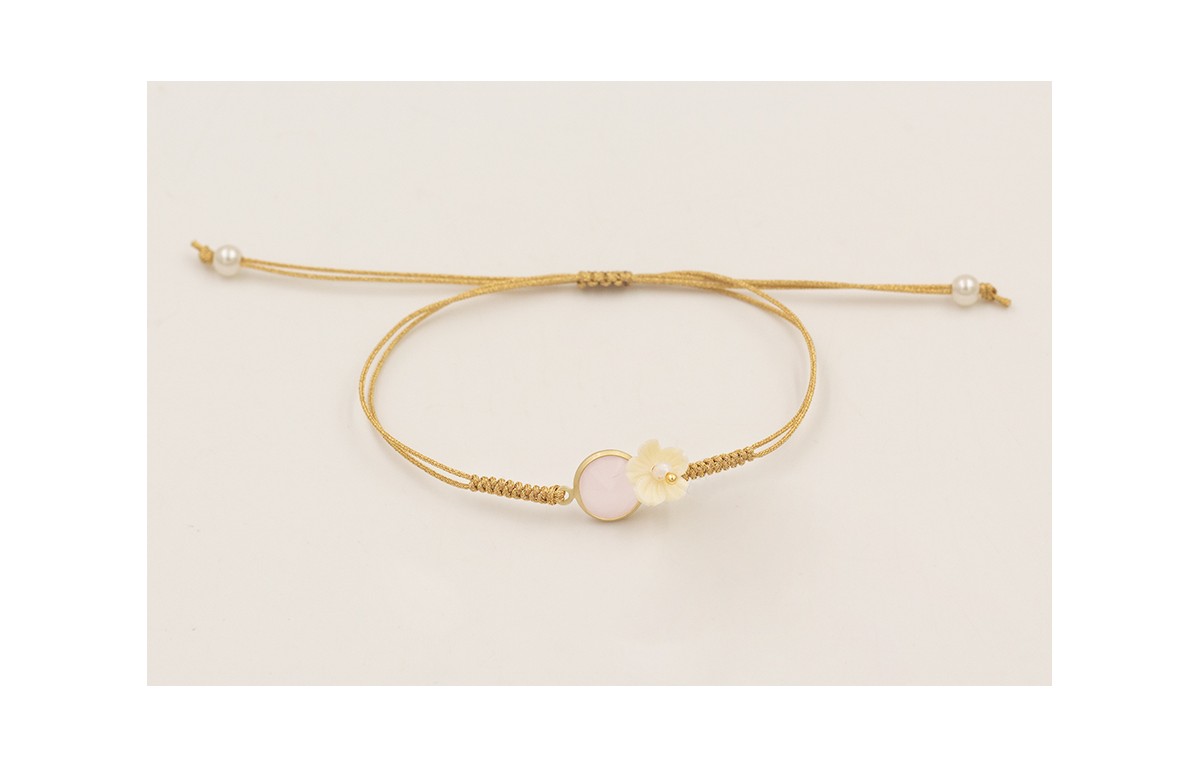 Pulsera hilo dorado con nudo serpiente, brillo rosa opal, flor resina de coral.