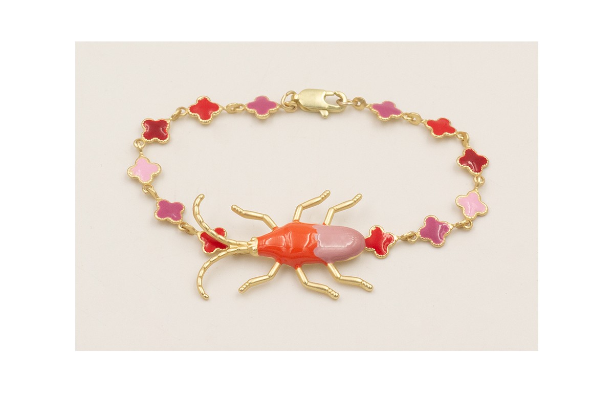Pulsera cadena mini treboles esmaltados lila,rojo,rosita con escarabajo antenas doradas mate cuerpo esmaltado lila y teja.