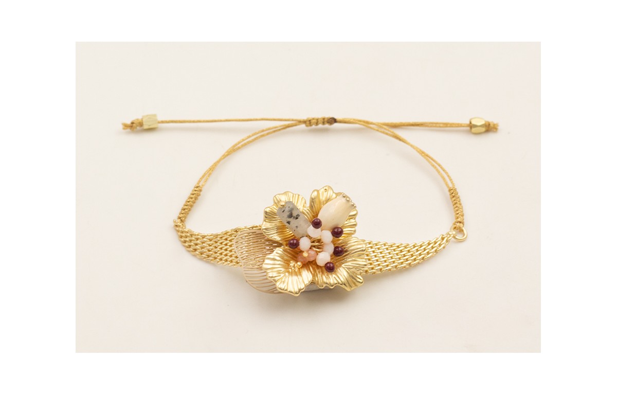 Pulsera rombo malla dorada mate con flor, burruño ovnis beiges, tubo piedra gris, tulipán esmaltado beige, hilo dorado con nudo macramé.