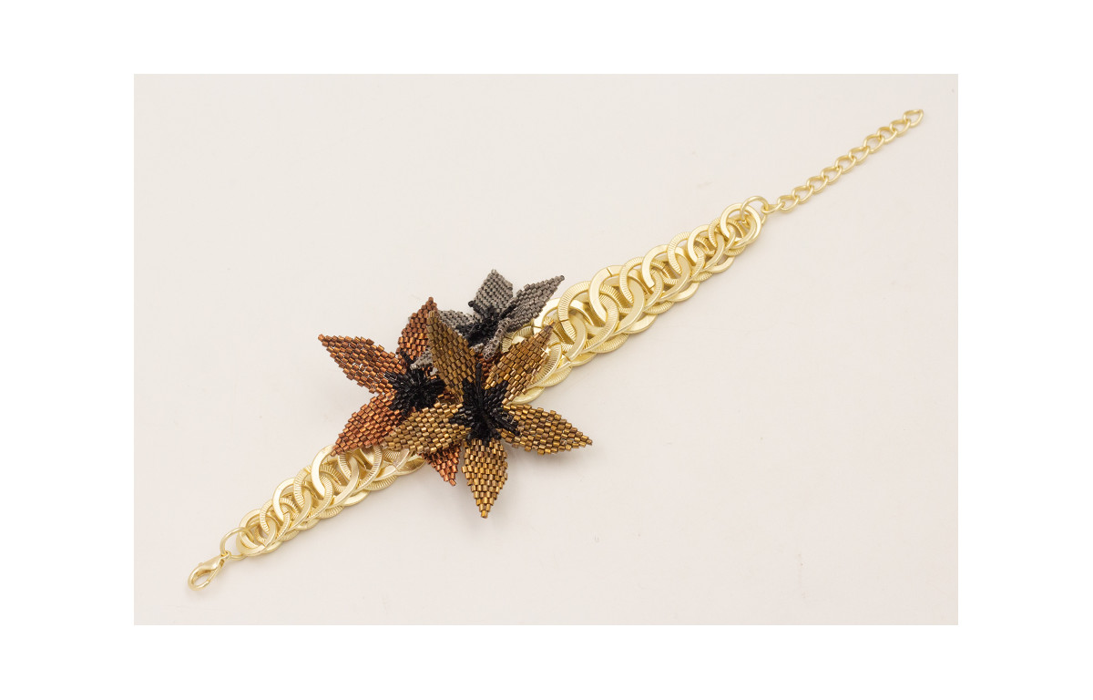 Pulsera completa de aros entrelazados dorado mate con flores de miyuki cobre, plateado, bronce.