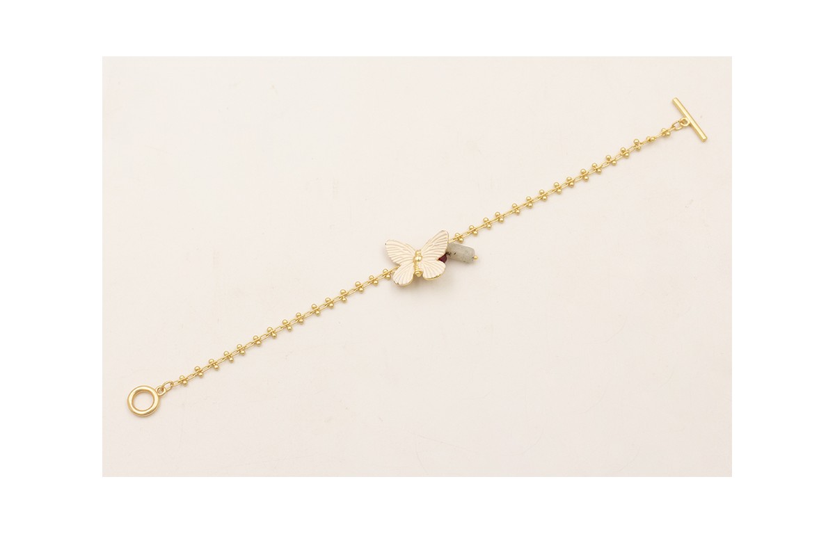 Pulsera cadena entrelazada 2 bolas dorado mate con mariposa esmaltada beige, tubo piedra gris, facetada granate con cierre de T.