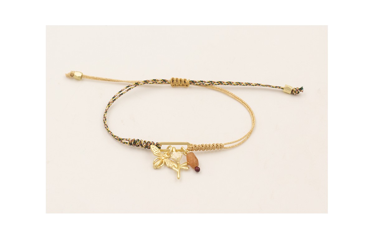 Pulsera de hilo por mitades dorado, verde,morado con eslabón dorado, rosa esmaltada beige, abeja dorado mate, piedra tostada.