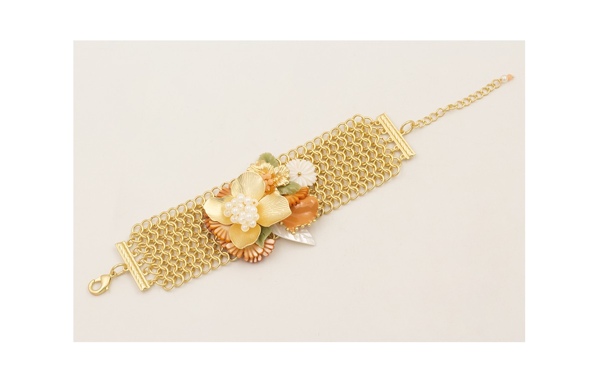 Pulsera malla con flor grande dorada mate, flor nacar, abanico nacar melocotón, hojas verdes,burruño facetadas melocotón, ramillete perlas.
