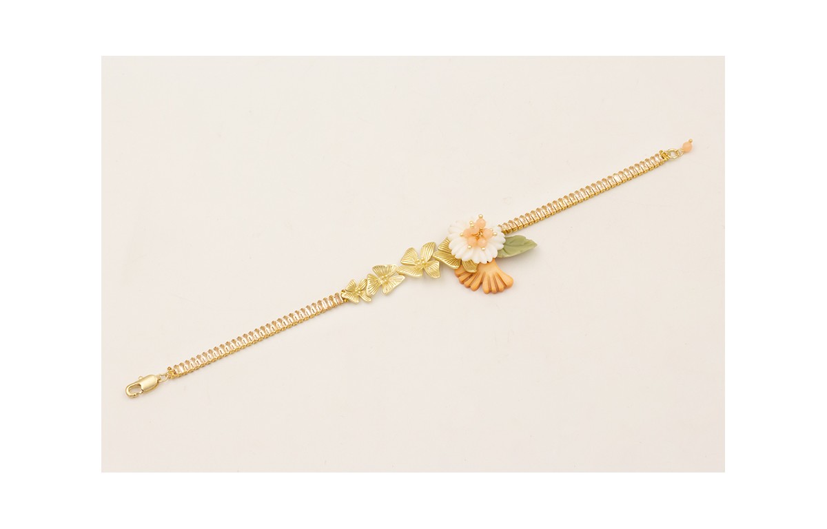 Pulsera cadena strass rectangular cristal, flores doradas mates, flor nacar con burruño facetadas melocotón, hoja verde, abanico nacar tostado.