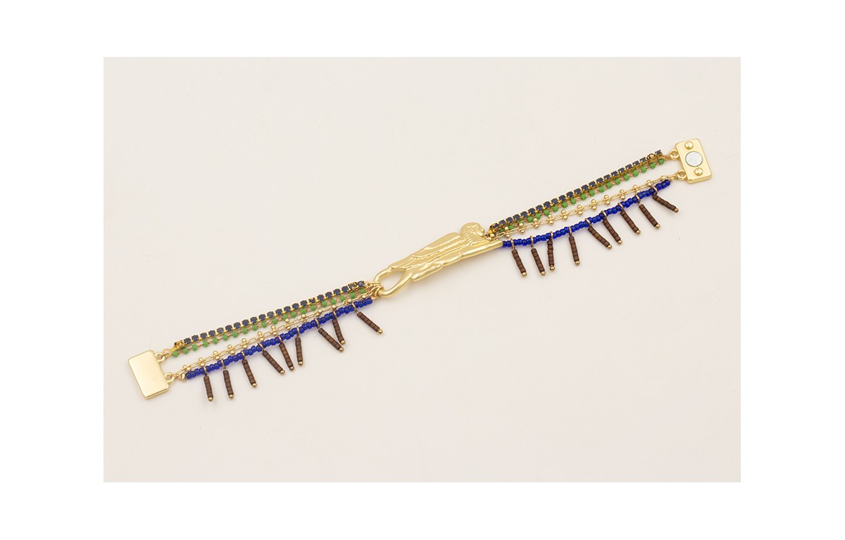 Pulsera pieza esfinge con tiras de cadena miyuki verde, cadena strass azul marino, cadena entrelazada 2 bolas y abalorio azulón con palitos de miyuki marrón, cierre de imán.