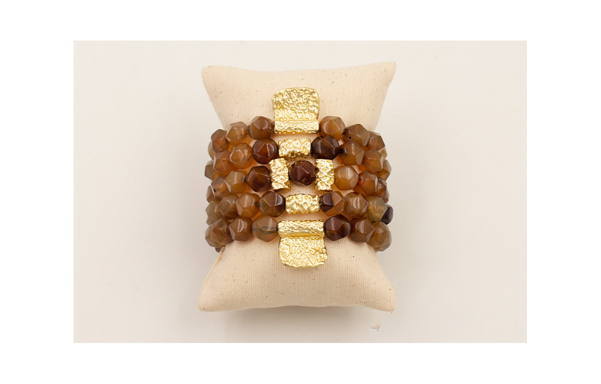 Pulsera ancha facetadas irregular marrón traslucido con entrepiezas labaras doradas mate.