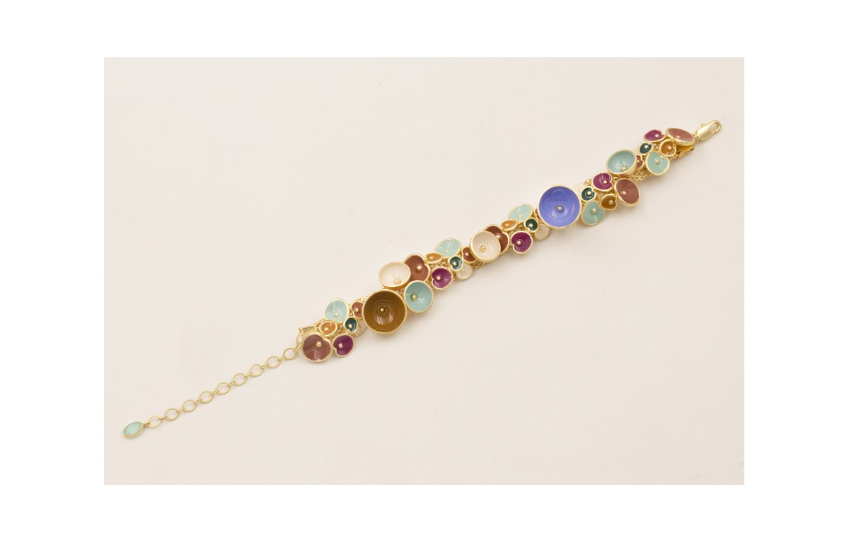 Pulsera cadena malla con semi bolas y colgantes flores esmaltadas beige, turquesa, marrón, azul.
