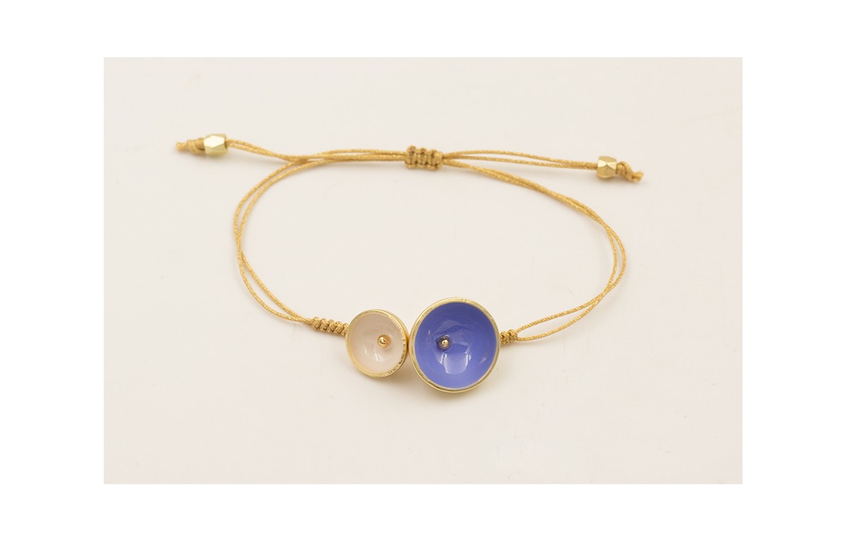 Pulsera hilo dorado con nudo serpiente y centro semibolas esmaltadas azul y beige.