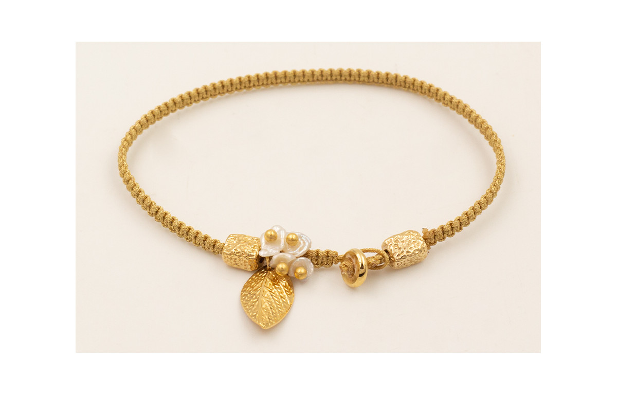 Pulsera hilo dorado con nudo macramé con hoja, pieza irregular cierre botón todo con BAÑO ORO 18K y chips madre perla.