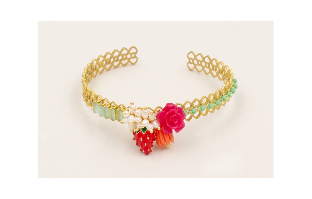 Pulsera rigida labrada dorada mate con burruño perlas naturales, cadena strass rectangulos turquesa, fresa esmaltada, bolitas turquesas, flor fucsia y campanilla coral de resina polvo coral.