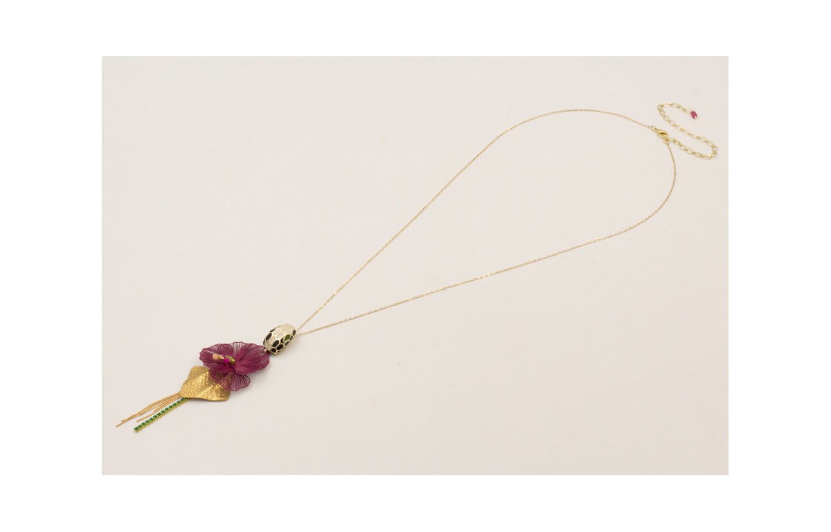 Collar cadena pequeña dorada con cabeza de serpiente esmalte, flor color cadenal, triangulo dorado y fleco cadena strass verde y dorado mate.