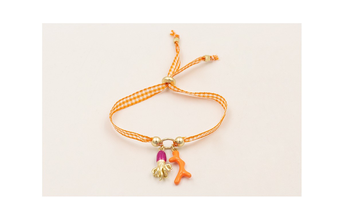 Pulsera lazo vichy naranja con rama coral esmalte naranja y calalmer esmalte morado.