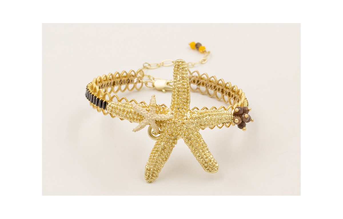 Pulsera rigida labra dorada mate con estrella grande, burruño facetadas marrones y estrella pequeña esmaltada beige, rematada con cadena alargadora.
