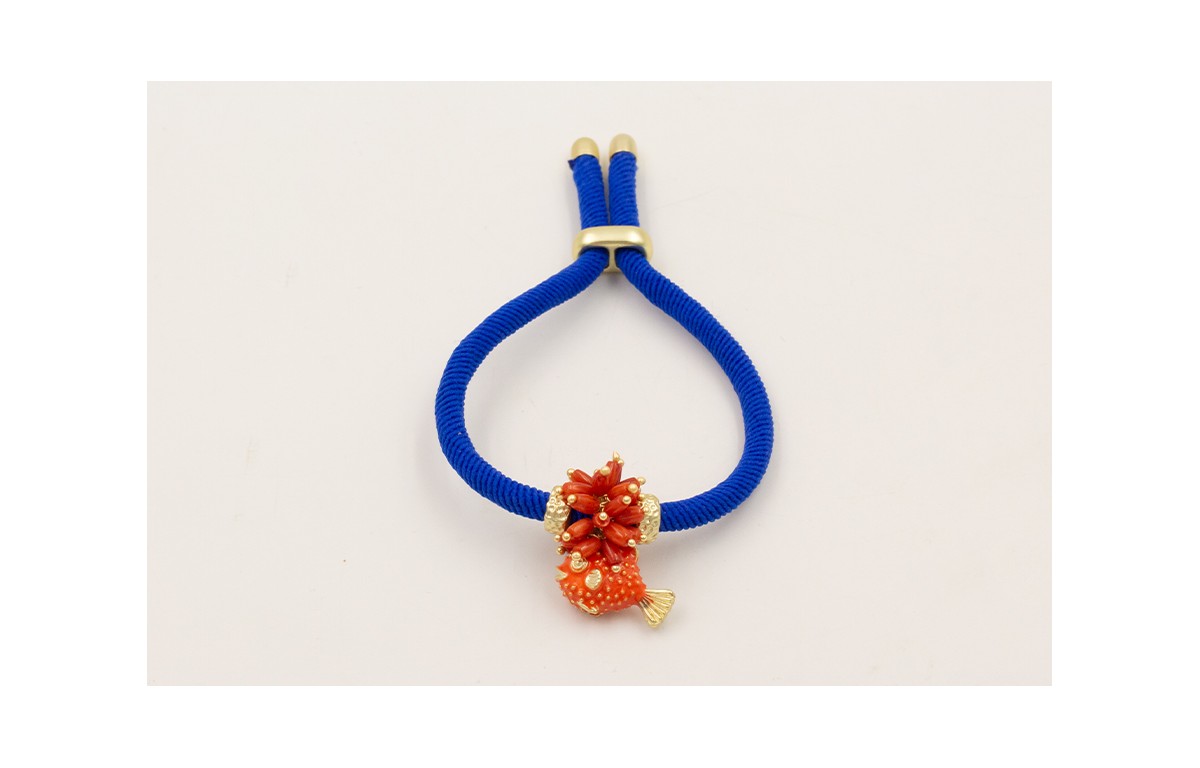 Pulsera cordón elastico azulón con pez globo esmalte naranja y burruño coralitos.