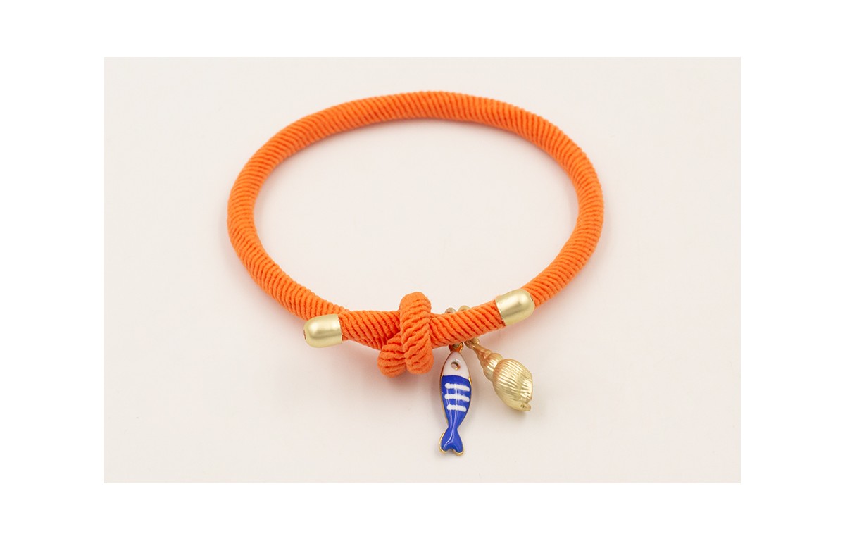 Pulsera cordón elastico naranja con pez esmaltado azul y blanco y caracola dorada mate.