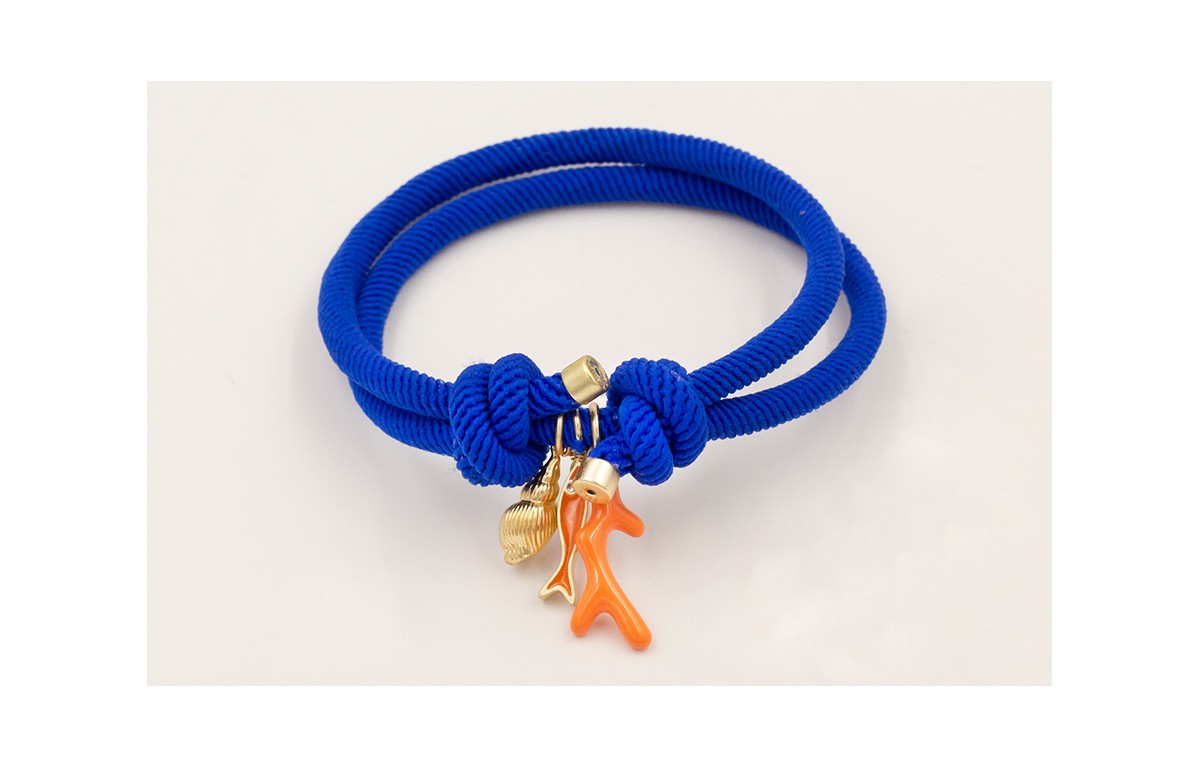 Pulsera cordón elastico azulón con nudos corredizos, pez naranja, caracola dorada mate y rama coral esmaltada naranja.