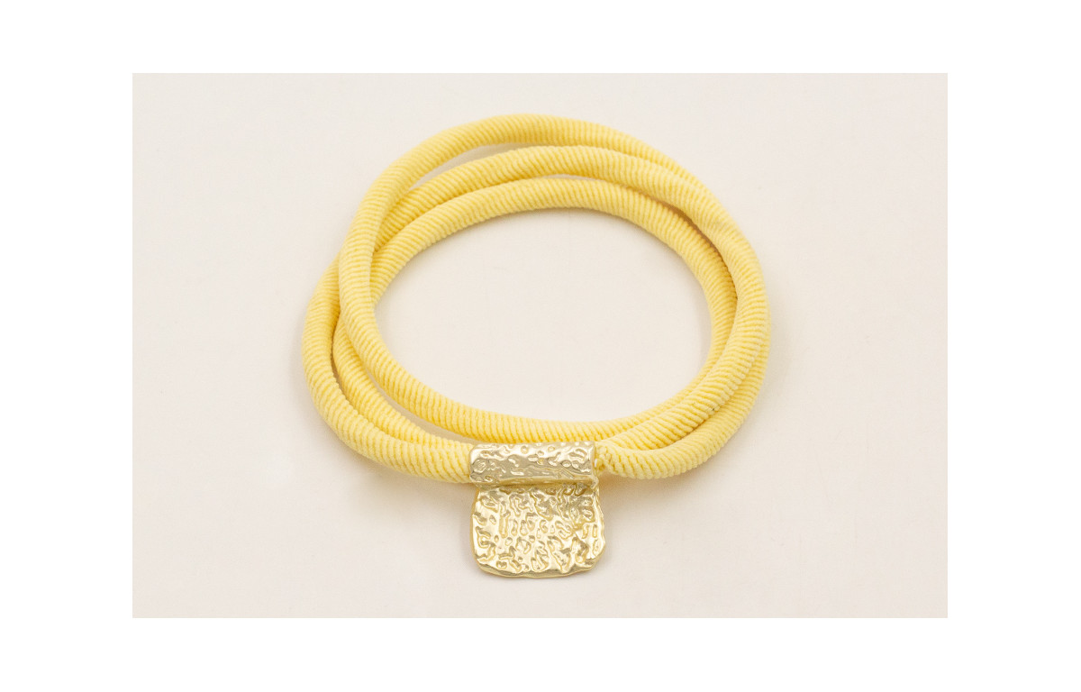 Pulsera 3 vueltas cordón elastico color amarillo pálido con colgante lámina doblada dorada mate.