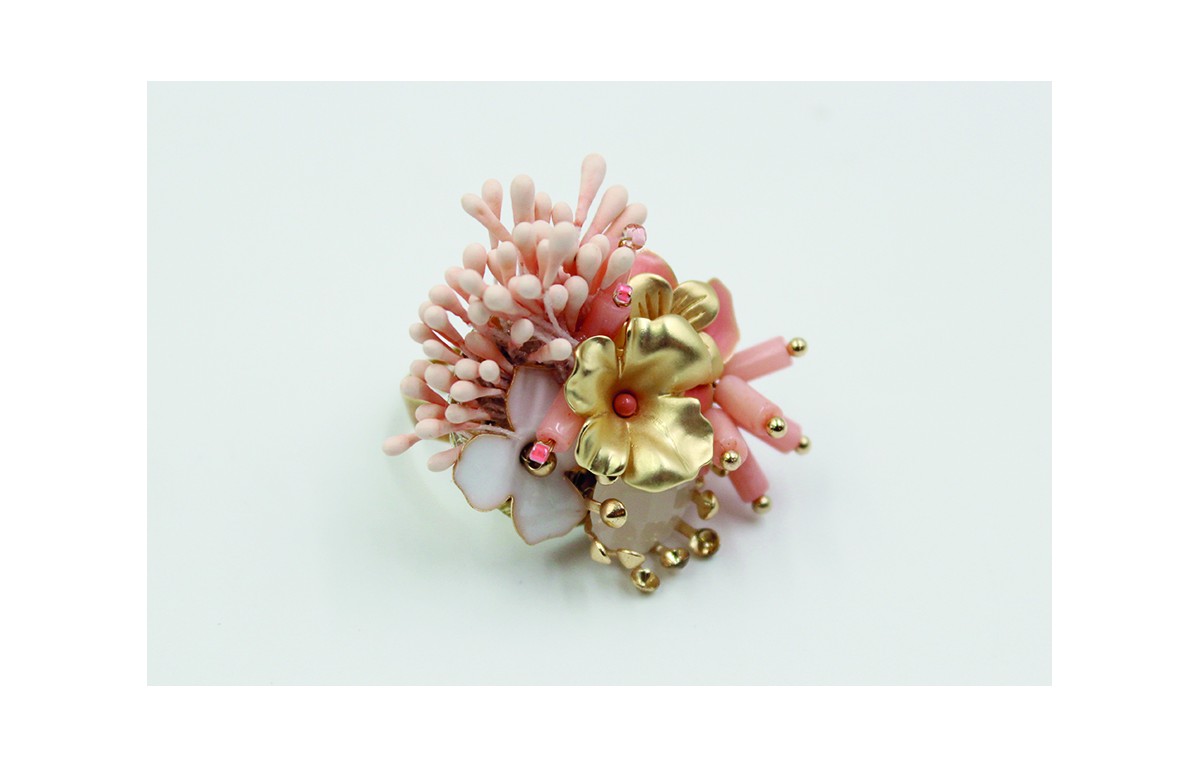 Anillo varias flores esmaltada blanca, oro mate, esmaltada rosa y pistilos rositas