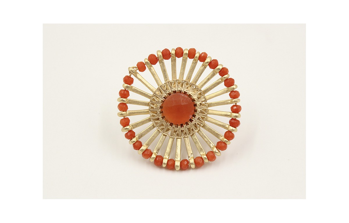 Anillo roseton con facetadas naranjas y listones en oro mate y brillo naranja opal. Es regulable.