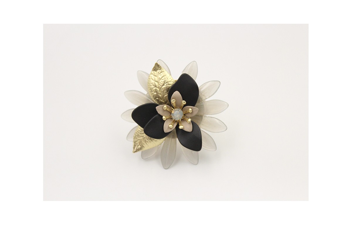 Anillo roseton dagas grises con flores esmaltada negra y visón, hojas oro mate. Es regulable