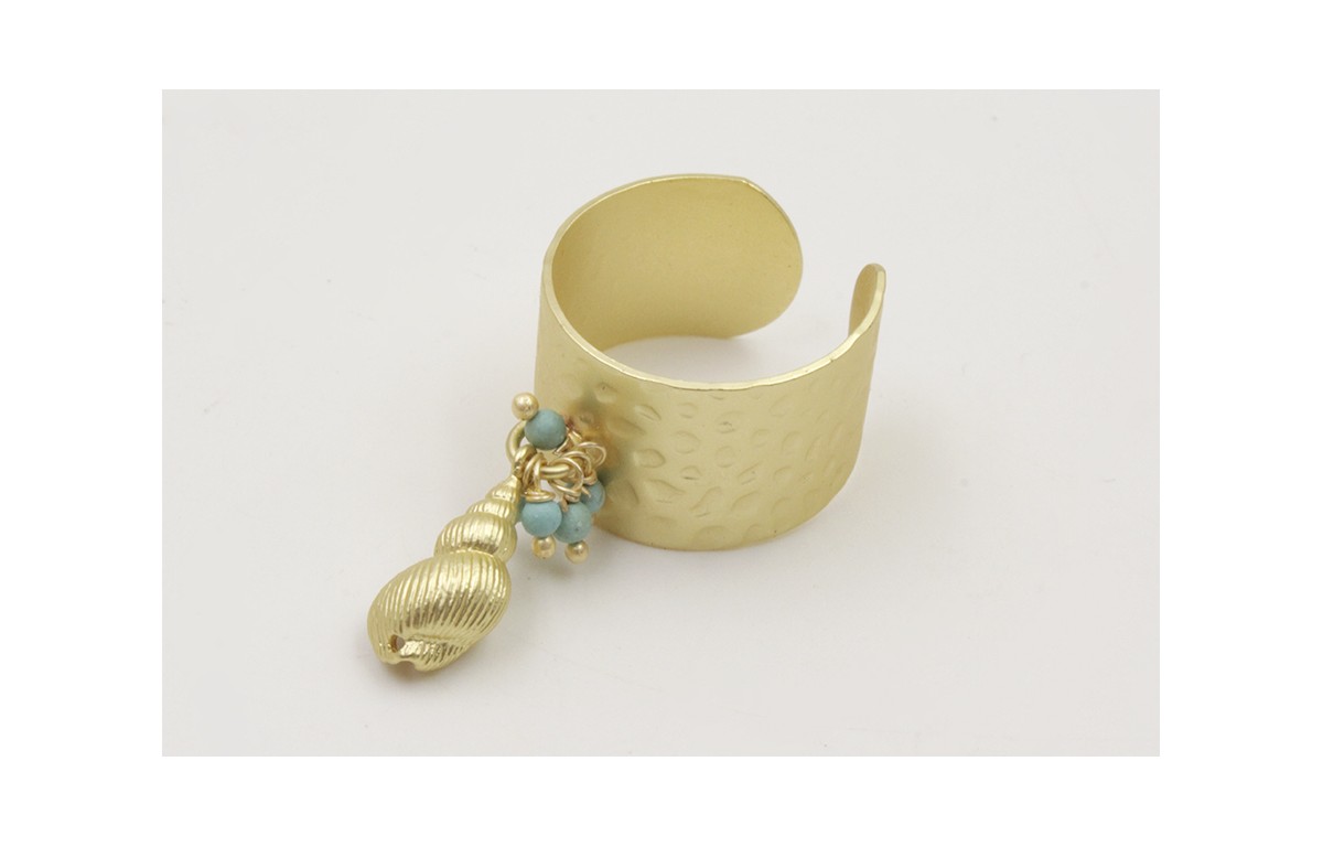 Anillo base labrada dorada mate con piedras turquesas y caracola dorada mate. Es regulable.