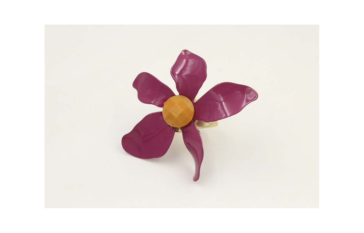 Anillo disco plano con flor esmaltada cardenal y brillo color mostaza. Es regulable.