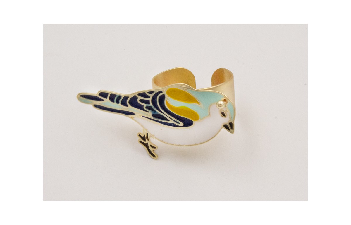 Anillo con pájaro plano esmlatado turquesa, mostaza y azul marino.