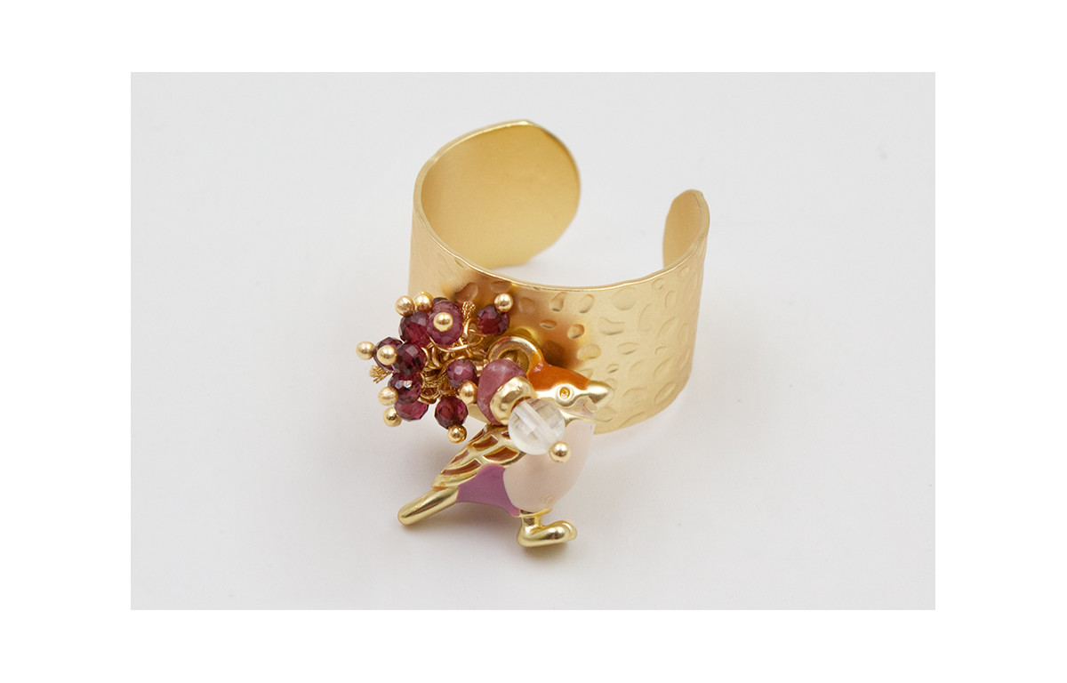 Anillo burruño cuarzos granates y pájaro esmaltado rosa, lila y marrón.