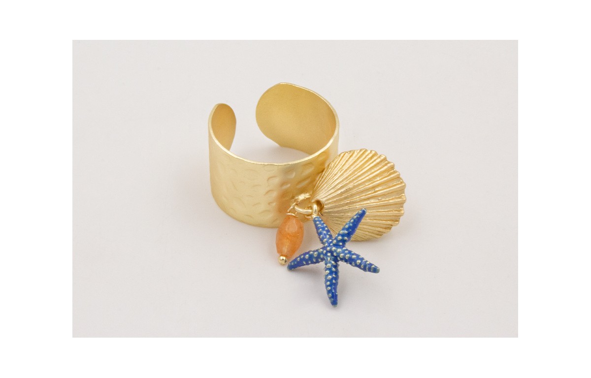 Anillo de arandela con concha dorada,estrella de mar azul oscuro y semipreciosa naranja