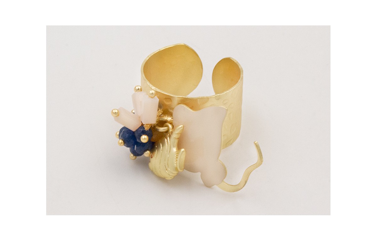 Anillo de arandela con manta raya beige,pez dorado,burrño azul oscuro y rectangulos beige