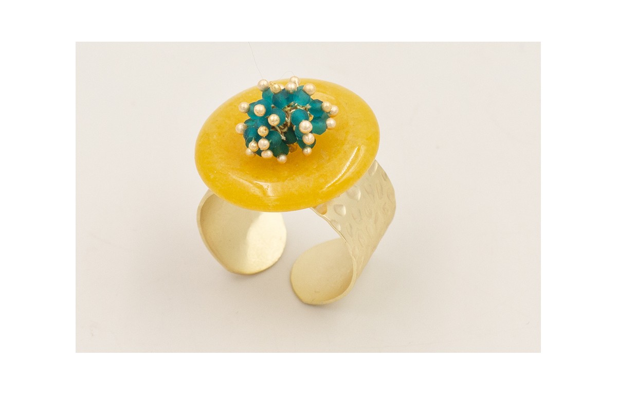Anillo dorado mate con disco cuarzo amarillo y burruño bolitas azules.