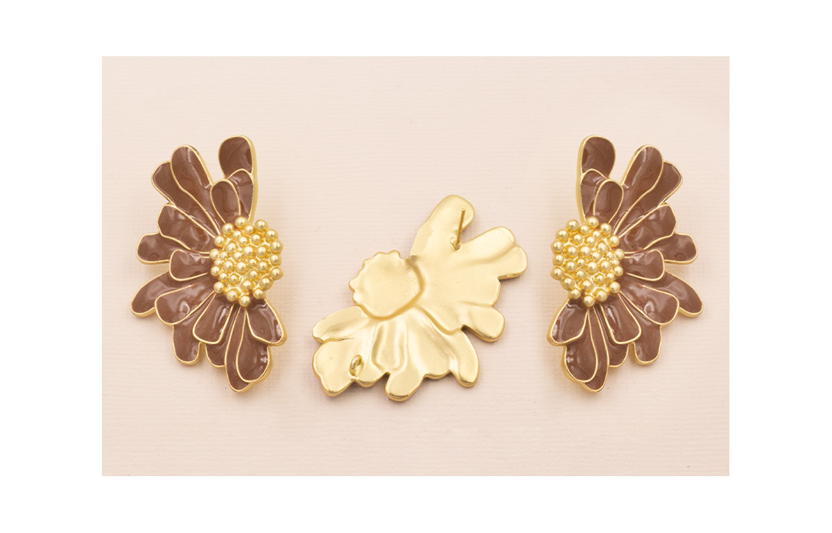 Pendiente Flor Oro Mate con Esmalte Marrón