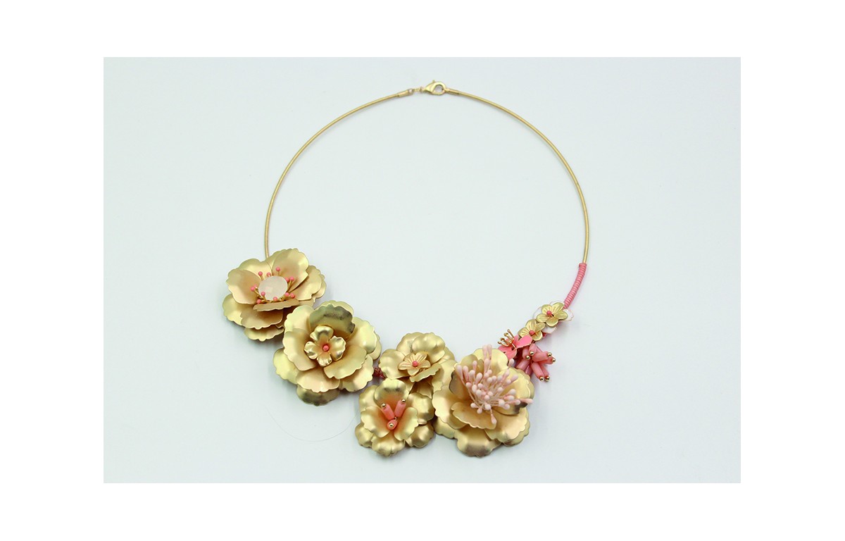 Collar rigido con flores de 3 capas en oro mate con detalles en rosa, flor esmatada blanca y flor esmaltada rosa.